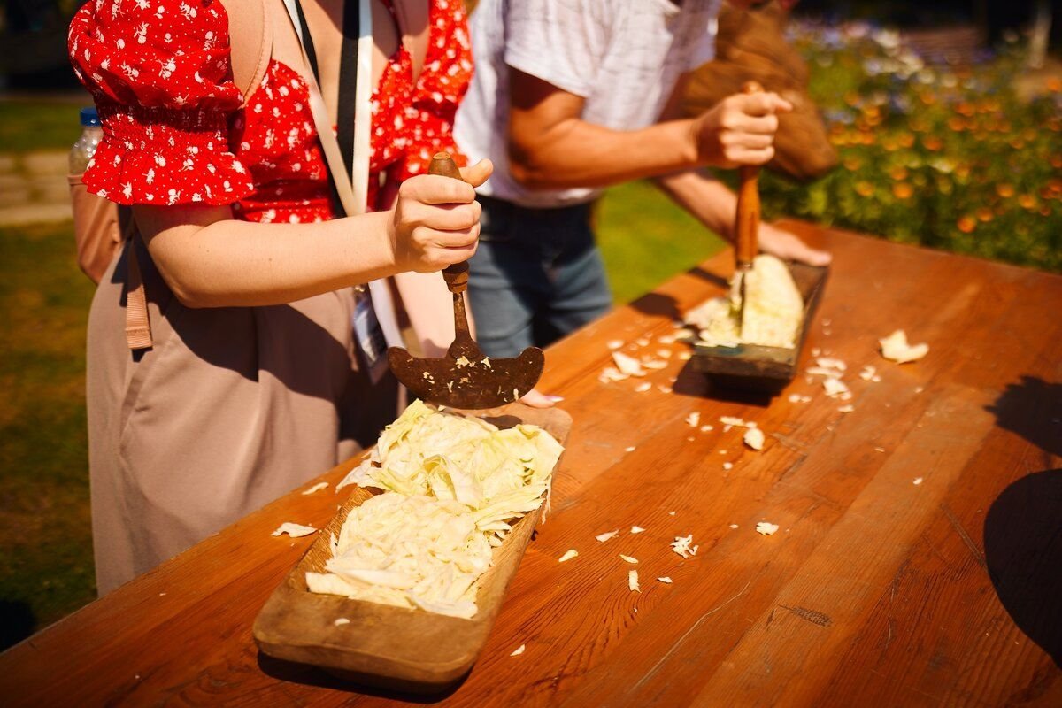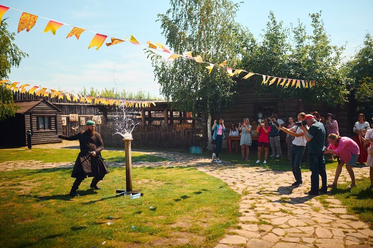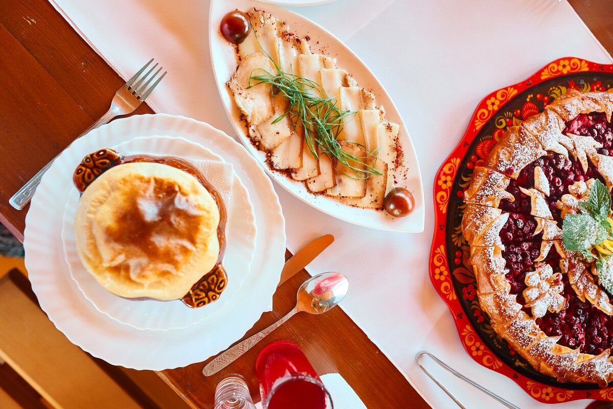 تجولنا في ورش العمل وذهبنا إلى وليمة سيبيريا. وهناك ... أذن القيصر ، مخلل محلي الصنع ، لفائف الكافيار ، رنجة متبلة ، شحم خنزير مدخن ومملح ، بطاطس على الطراز الريفي في كريمة حامضة ، زلابية ، فطيرة عنب الثعلب وعصير التوت البري.
