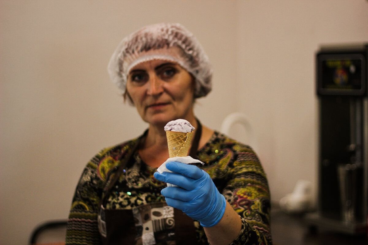 من الأطباق الشهية التي يتم تقديمها في المقهى جيلاتيو * آيس كريم سالفاتور كابيلانو. جاء المايسترو خصيصًا إلى الحديقة البيئية لمشاركة مهاراته وخبرته في إنتاج الآيس كريم الإيطالي. "تحدثنا إليه عن الآيس كريم وحب المساحات المائية. قالت زانا فلاديميروفنا ، وهي تملأ مخروطي بجزء من آيس كريم التوت الأزرق: "إنه يحب البحر كثيرًا".